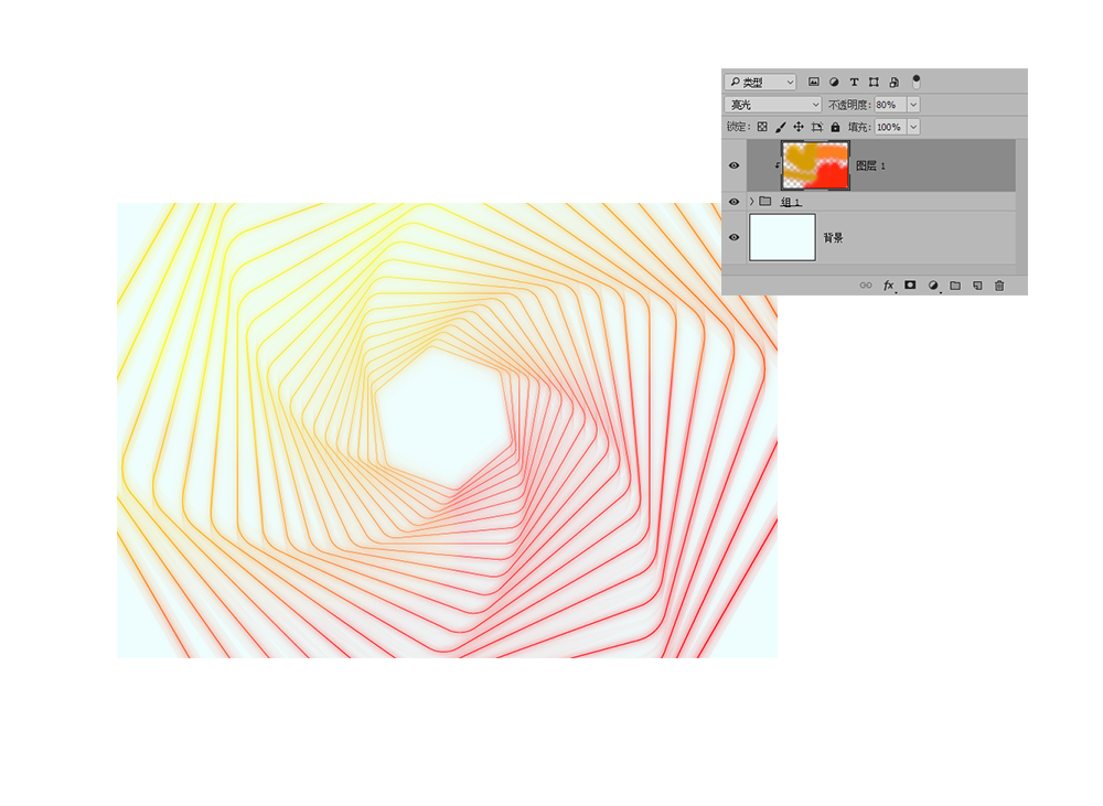 最后将线条图层(以及四个模糊图层)合并一组,在该组的上方新建一个图层,将其设定为改组的剪贴蒙板。这时再利用大而软的画笔进行涂抹并继续为其增色,而又不影响到背景。涂抹完后,将这个图层的图层样式改为亮光,透明度降至80%。
