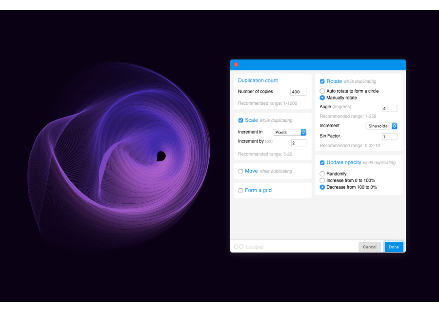 安装好的Looper,在Sketch绘制任一图形选中,打开> Plugins > Looper > Loop,我们可以看到参数设置,如下图: