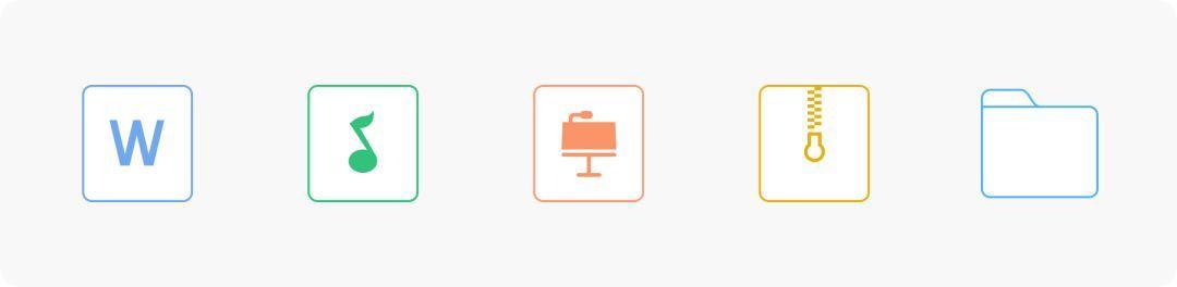 2. 文件后缀名从图标里移到了文件名的末尾,原本的卡片变成了线框,和图形符号一起填充了相同的颜色。图形识别和色彩识别相结合,识别特征扁平化。